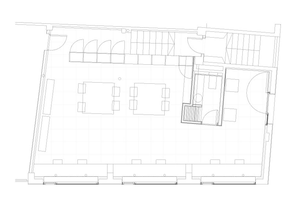 La preexistencia de la bóveda de una escalera que sube a la planta superior, resulta determinante para ubicar bajo ella el aseo, que va a ser el único ámbito cerrado del estudio. Nos vamos a servir también de este volumen para separar la zona de acceso de la zona de trabajo.